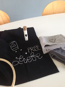 Mit einem Kreidestift aus dem Schneiderbedarf habe ich mir die Wörter und die Zeichnung auf die Tücher und die Schürze geschrieben. Eingespannt im Stickrahmen habe ich die Wörter und den Streuer mit einem geraden Stich gestickt.